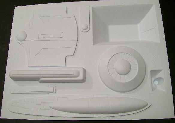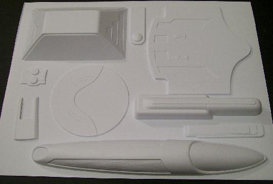 The kit comes on two 13x10 sheets of vacuformed plastic, so all of the parts will need to be trimmed out of the sheet. The 17 parts appear to be crisply formed, and I think construction will be pretty straight-forward. A sheet of styrene stock is also included to help bulk-up the internal portions. I’ll probably have to add some internal supports for the warp nacelle pylons to make sure that they can support the weight of the upper portion of the ship.