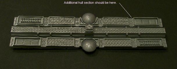 The only hope a builder has is to either completely scratchbuild the missing section, or be lucky enough to find a duplicate kit that has been partially built (or scrap pieces thereof) to allow them to salvage the missing section. I was fortunate enough to know someone who offered me the scrapped remains of their old Cygnus kit. I have since used a razor saw to separate one of the missing hull sections for another friend who wished to build this kit.